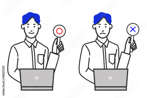 シャツを着たオフィスカジュアルでパソコンの前に座るエンジニア風の男性のマルバツやオッケーなどの表情バリエーションの白背景に線画のシンプルなイラスト