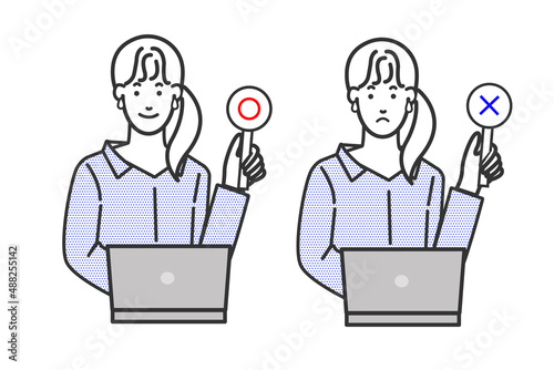 パソコンの前に座るフェミニンでおしゃれなアジア人女性の表情のバリエーションの白バックのシンプルな線画のイラスト