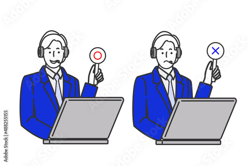 インカムマイクをつけた男性テレフォンオペレーターの上半身のイラスト表情セット