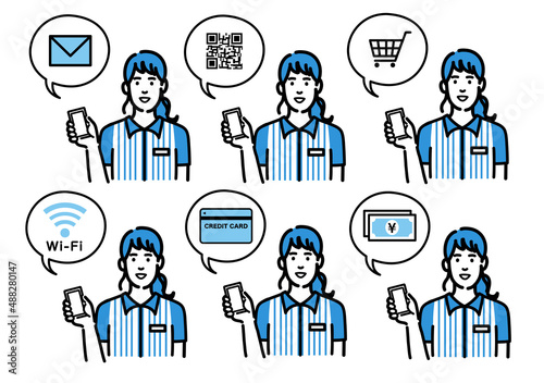 スマートフォンを持って説明をしているコンビニ店員の若い女性のセット