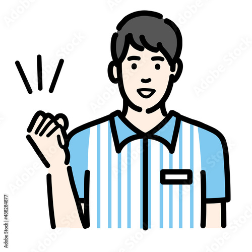笑顔でガッツポーズをしているコンビニ店員の若い男性