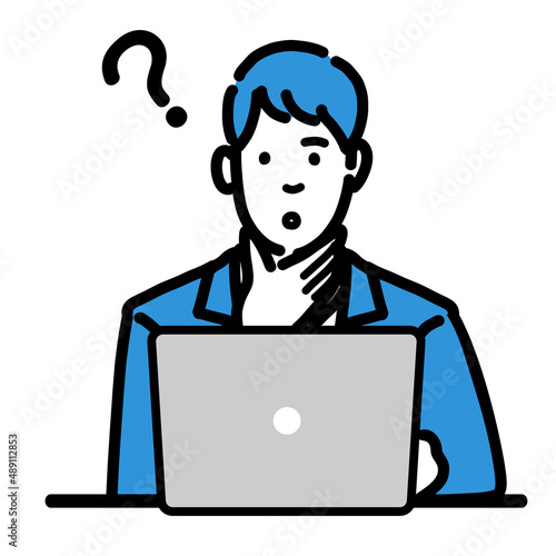 ラップトップの前で顎に手をあてて考えているスーツを着た若い男性
