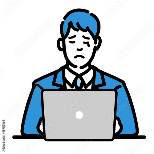 ラップトップの前で悲しそうに涙を流しているスーツを着た若い男性