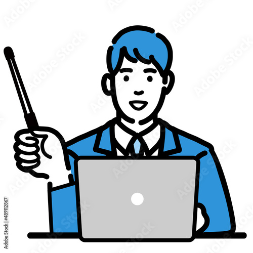 ラップトップの前で指し棒で解説をしているスーツを着た若い男性