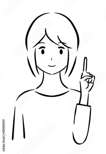 指を立ててポイントを説明している若い女性のモノクロ線画イラスト