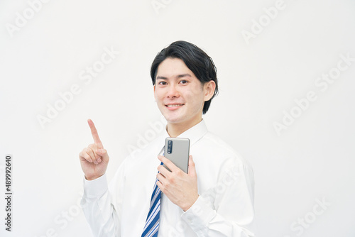 ビジネスマン スマートフォン 指差し 白背景