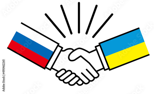 ロシアとウクライナ、国旗がついた手が握手 国家間の戦争紛争 同盟、和解、合意のイメージイラスト