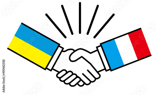 ウクライナとフランス、国旗がついた手が握手 国家間の戦争紛争 同盟、和解、合意のイメージイラスト