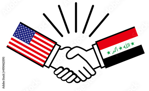アメリカとイラク、国旗がついた手が握手 国家間の戦争紛争 同盟、和解、合意のイメージイラスト