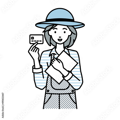 立って書類とカードを手に持つ農家の女性