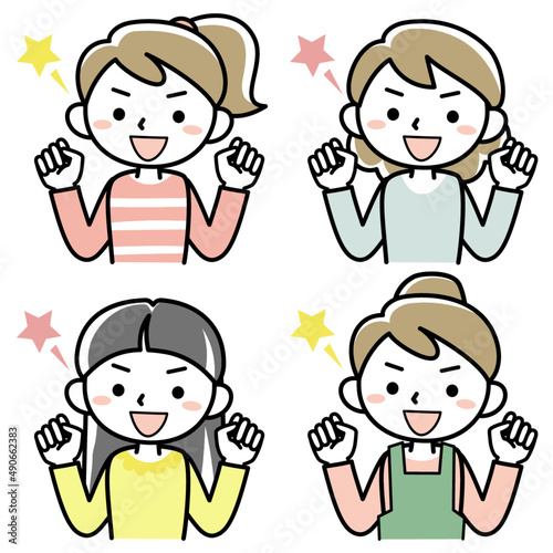 ガッツポーズをする若い女性の上半身セット