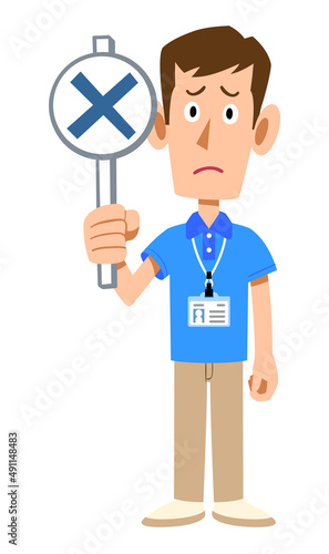 半袖のポロシャツ姿でネームタグを身に着けた男性スタッフの札を掲げる仕草