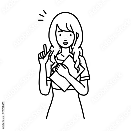 立って書類を手に持って何かひらめいたエステ店員の女性