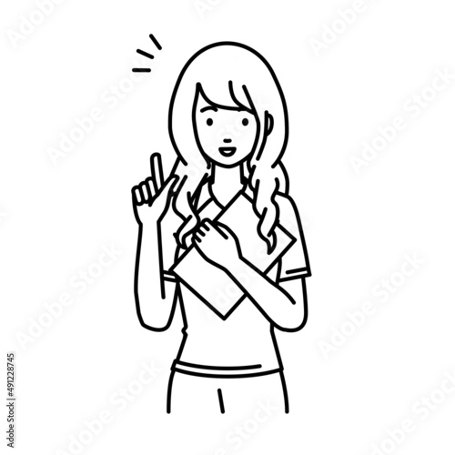 立って書類を手に持って何かひらめいたポロシャツの女性