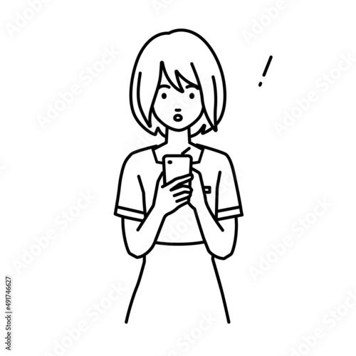 立ってスマートフォンを操作して何かに気づいて驚いたエステ店員・受付・接客業の女性
