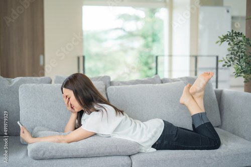ソファで寝転んでスマホを使う女性(考える)