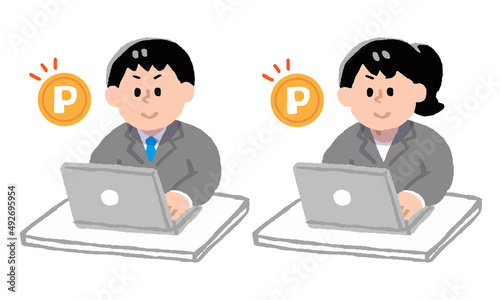 ポイントを獲得するパソコン作業するスーツ姿の男女
