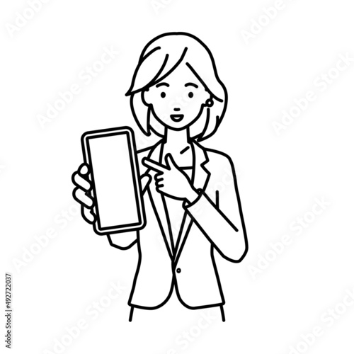 立ってスマートフォンを指差してこちらに向けて見せているスーツの女性