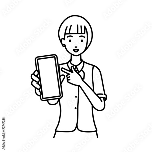立ってスマートフォンを指差してこちらに向けて見せている事務員制服の女性