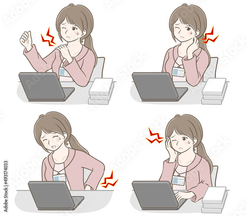 パソコン作業で色々な部分が痛む若い私服女性社員