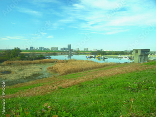 若草生える江戸川土手から見る枯れた荻原のある河川敷風景