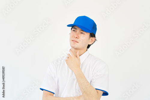 男性 ポロシャツとキャップのユニフォーム 考える 白背景