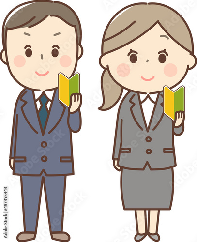 初心者マークを持った会社員男女セット
