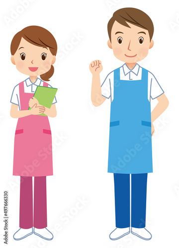 エプロンをつけた男女 介護士 スタッフ