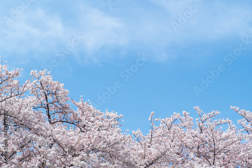 満開の桜並木と青い空