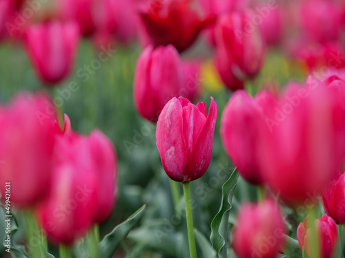 春の花畑の赤いチューリップ