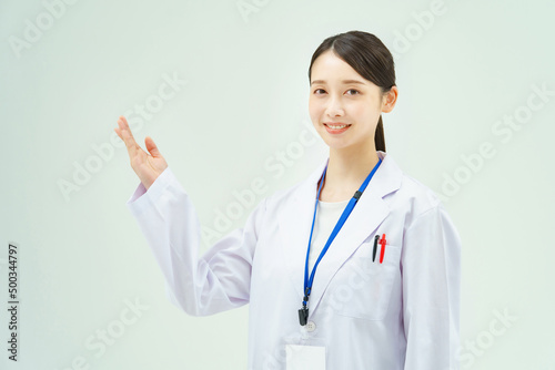 案内のポーズをする白衣の女性