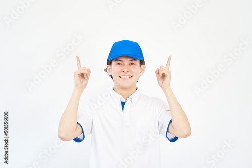 ポロシャツとキャップの制服の男性 指差し 白背景