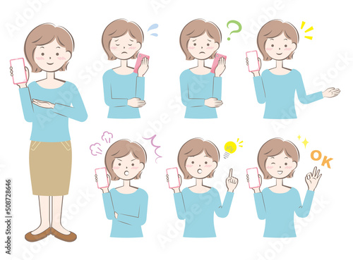 スマホを持つ様々な表情の女性 全身 上半身 バリエーション