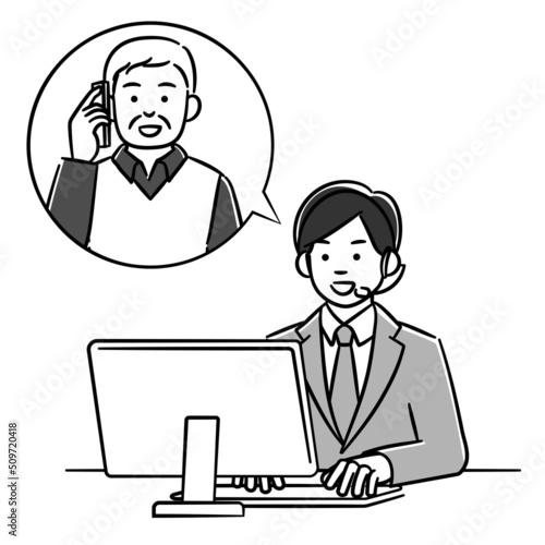 シニア男性と電話で話すオペレーターの男性のモノクロイラスト