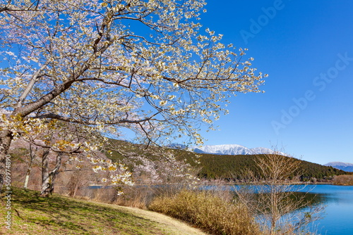桜と雪を頂いた山(毛無山方面を望む) 静岡県富士宮市田貫湖にて