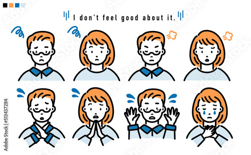 ネガティブな表情の男性と女性の上半身 イラスト_オレンジと青