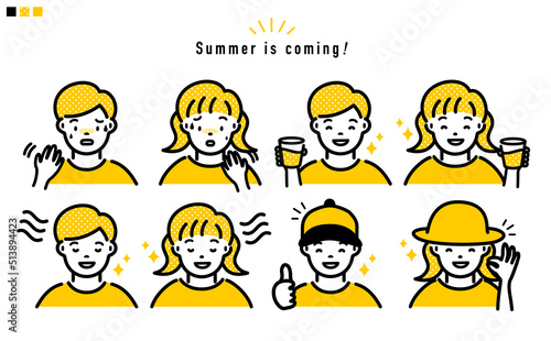 熱中症対策 女の子と男の子の上半身 イラスト_黄色