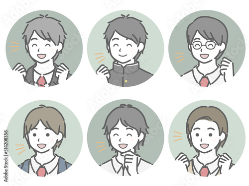 喜ぶ男子学生の斜め向き丸アイコンセット