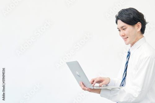 コピースペースがある白バックでノートパソコンを使うビジネスマン