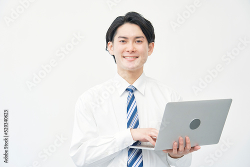 白バックでノートパソコンを使うビジネスマンのポートレート