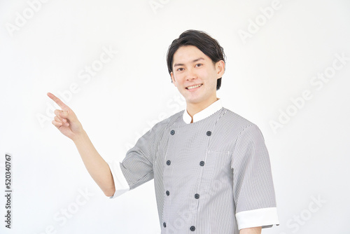 左側を指差しする男性パティシエ 白背景