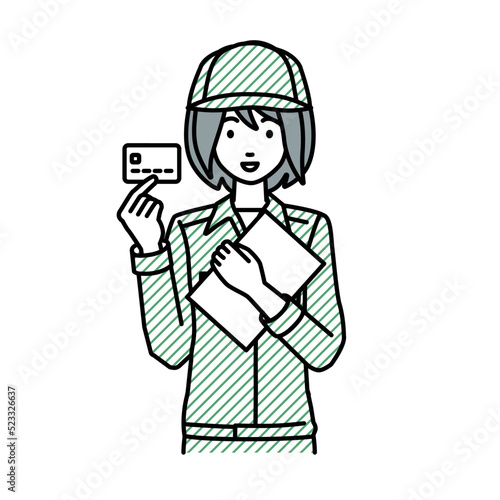立って書類とカードを手に持つ作業員の女性