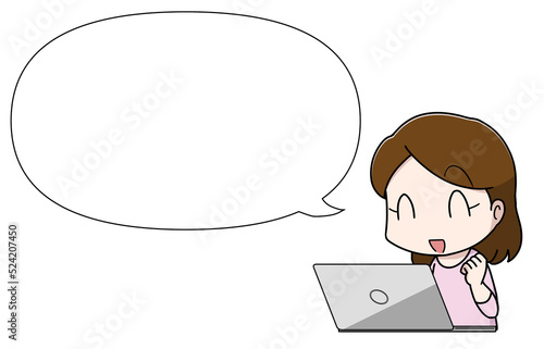 ノートパソコンを使う大人の女性・喜び顔 フキダシ付き
