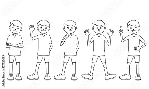 様々な表情とポーズの子供(男の子)のイラスト(白背景・ベクター・線画・切り抜き)
