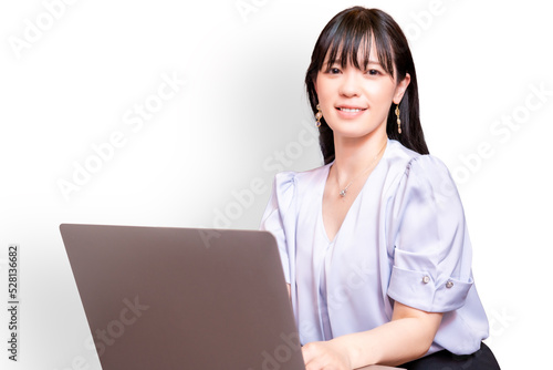 笑顔でノートパソコンを操作する女性