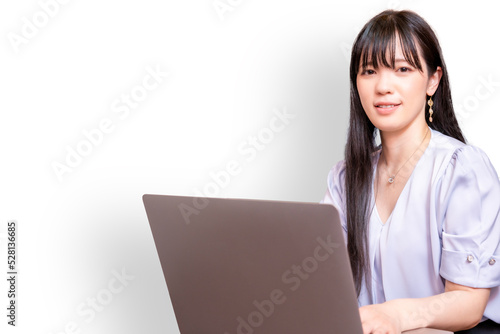 笑顔でノートパソコンを操作する女性