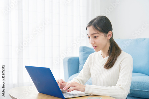 リビングでノートパソコンを使う女性
