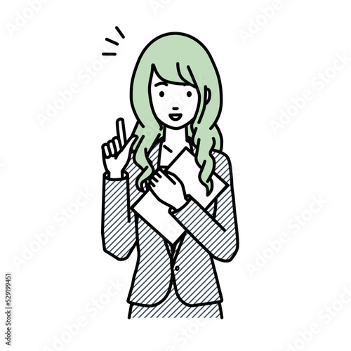 立って書類を手に持って何かひらめいたスーツの女性