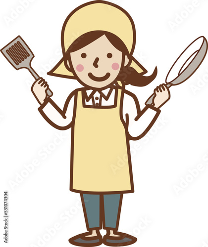 フライ返しとフライパンを持つ笑顔のエプロン姿の女性。