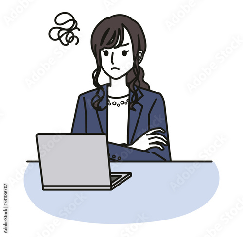 パソコンの画面を見てイライラするオフィスカジュアルコーデの女性